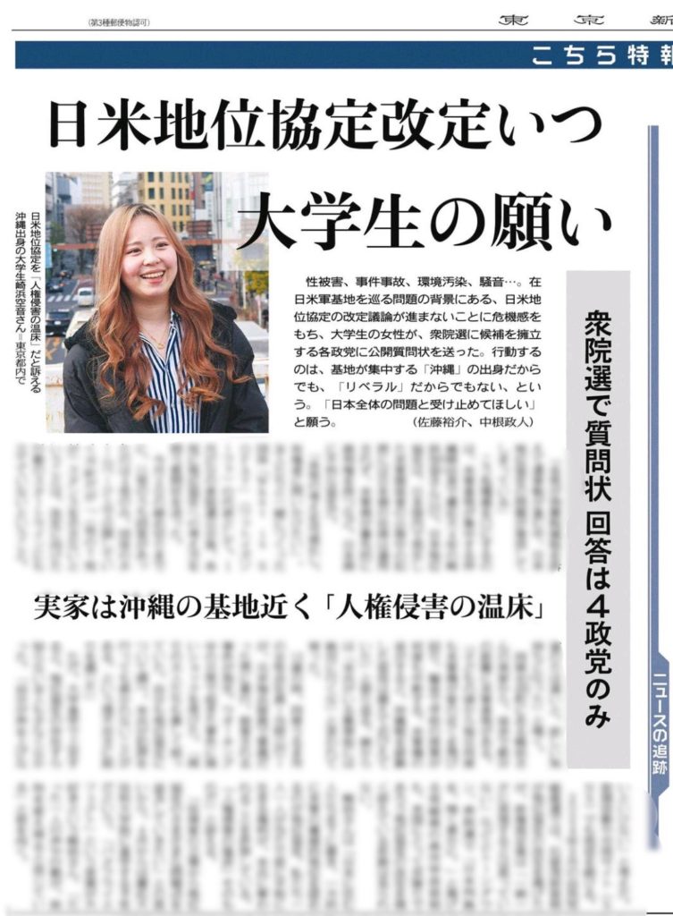 記事では、衆院選候補政党への公開質問状送付の背景や、若者の視点から捉えた日米地位協定の現状、そして活動の原動力となっている想い・経験について取材を受けています。